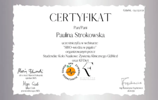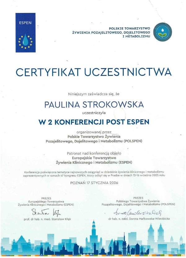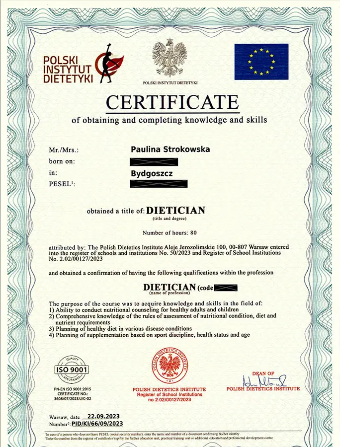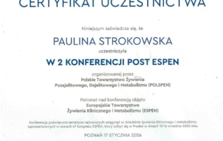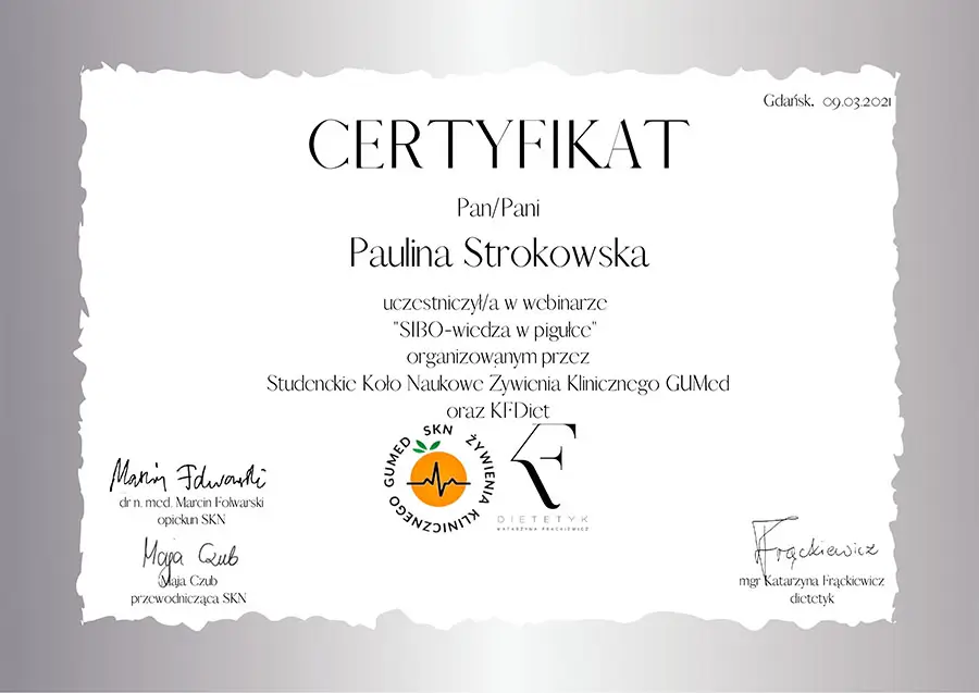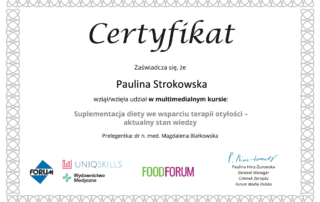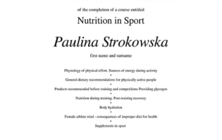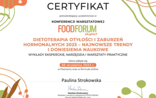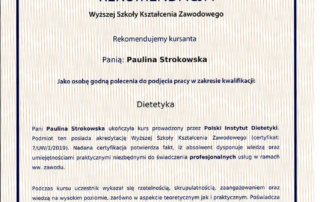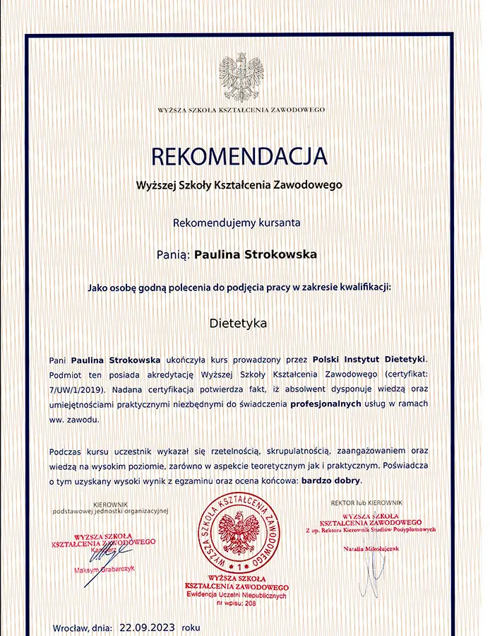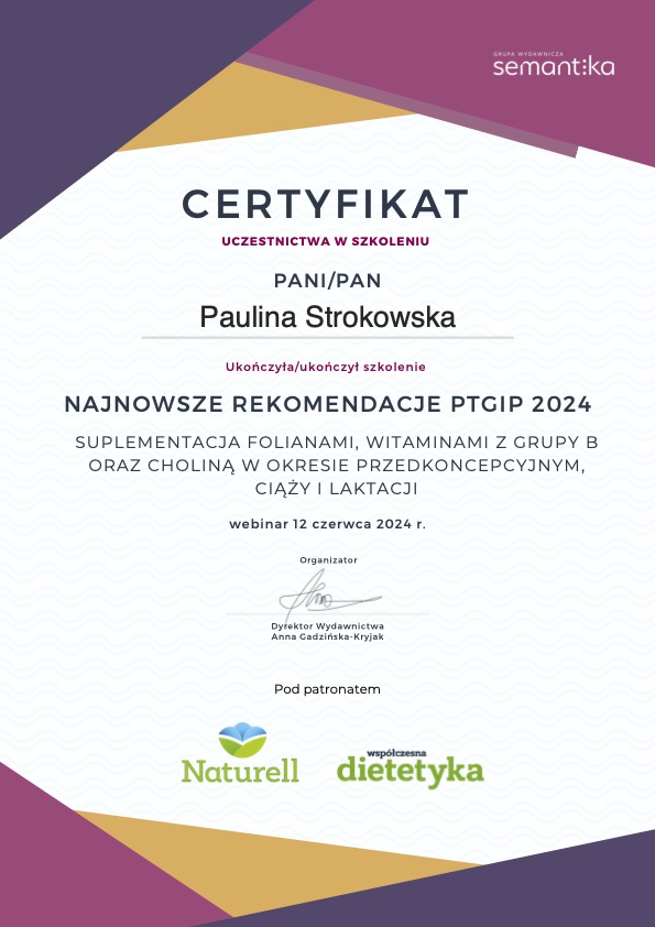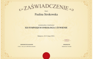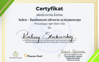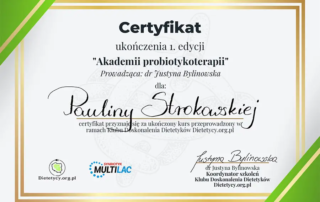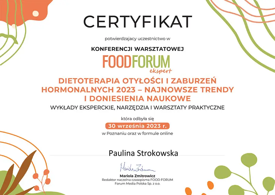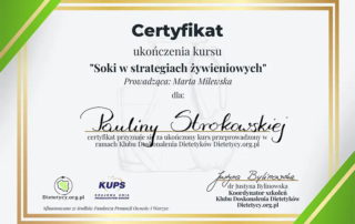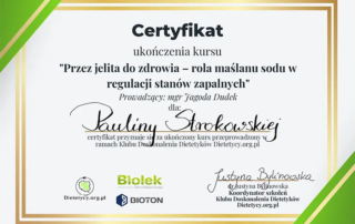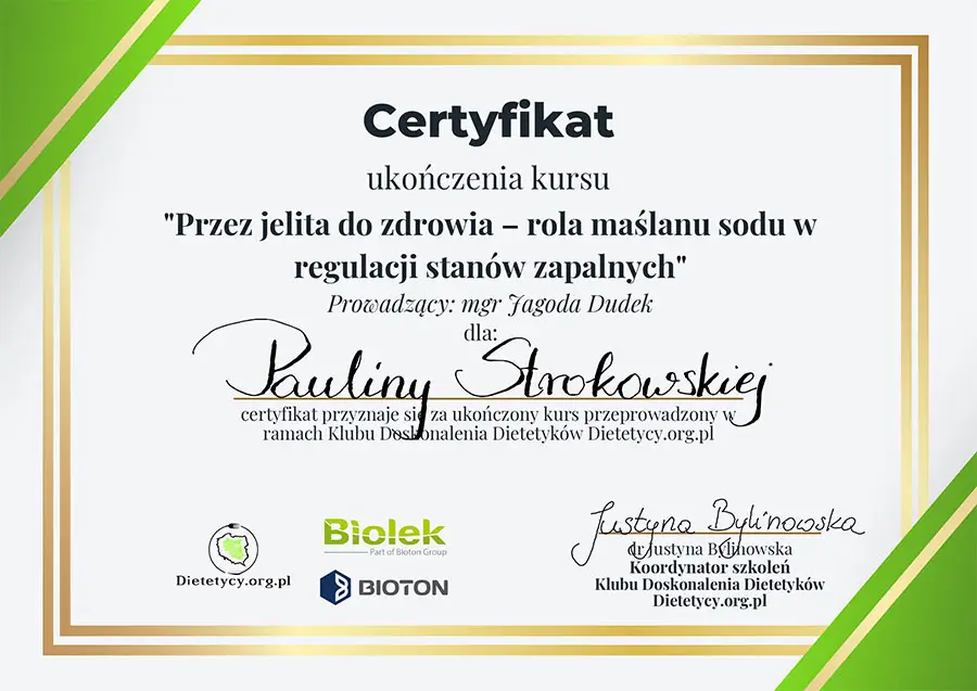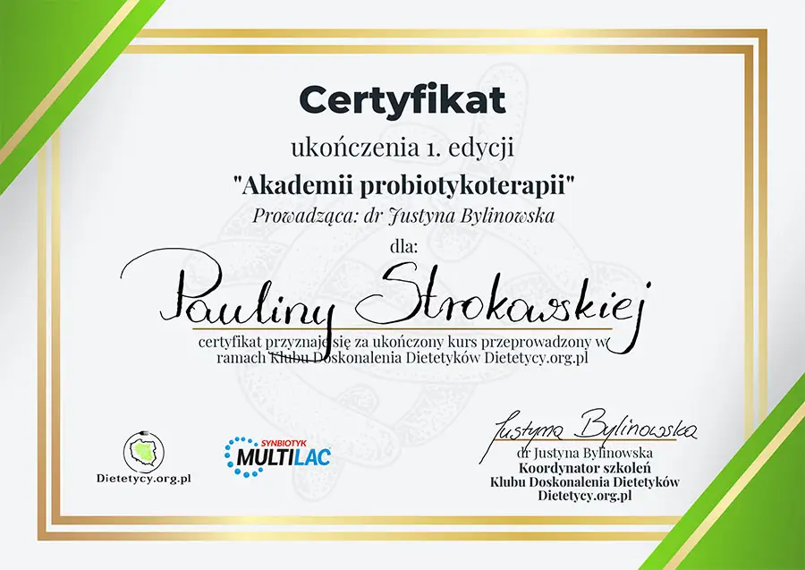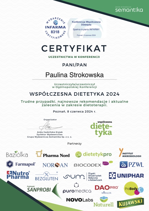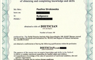 Moje zaangażowanie w dietetykę potwierdzają liczne certyfikaty i dyplomy, które zdobyłam na przestrzeni lat. Dzięki ciągłemu kształceniu i udziałowi w profesjonalnych szkoleniach, mogę zaoferować najwyższy poziom usług dietetycznych.