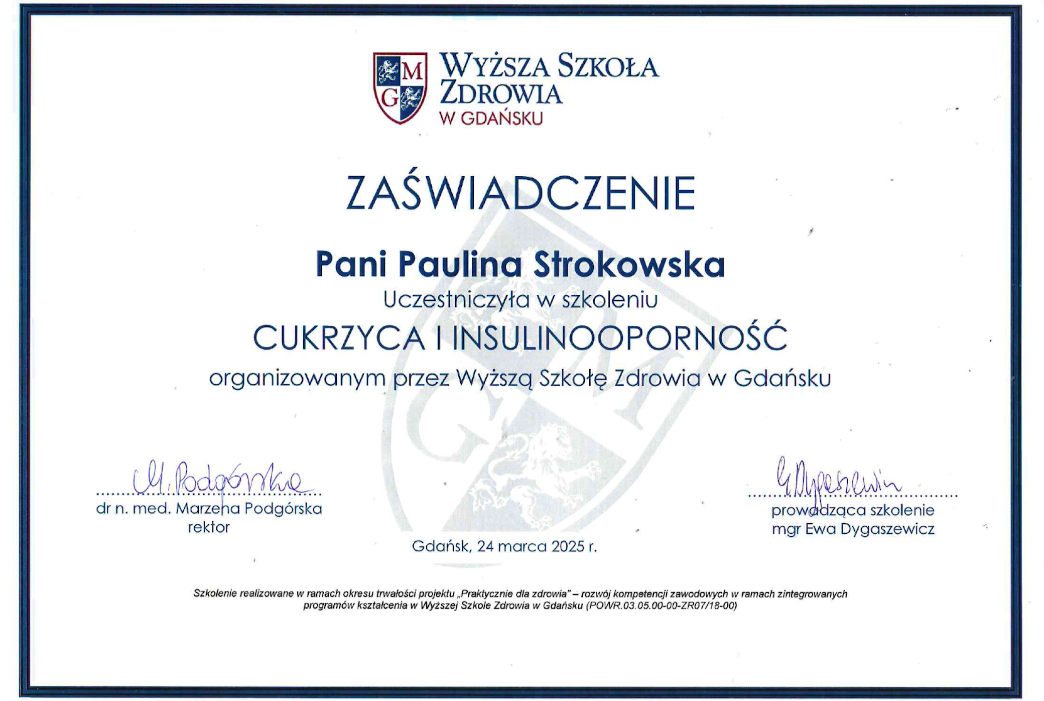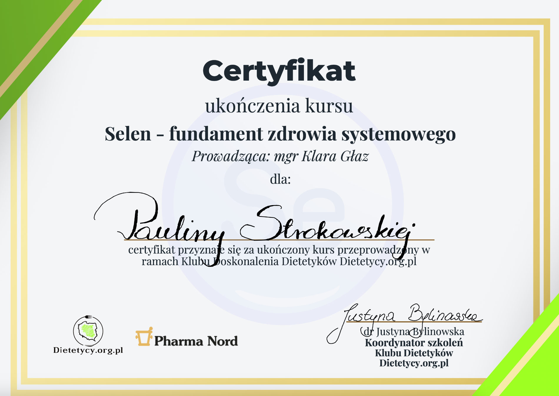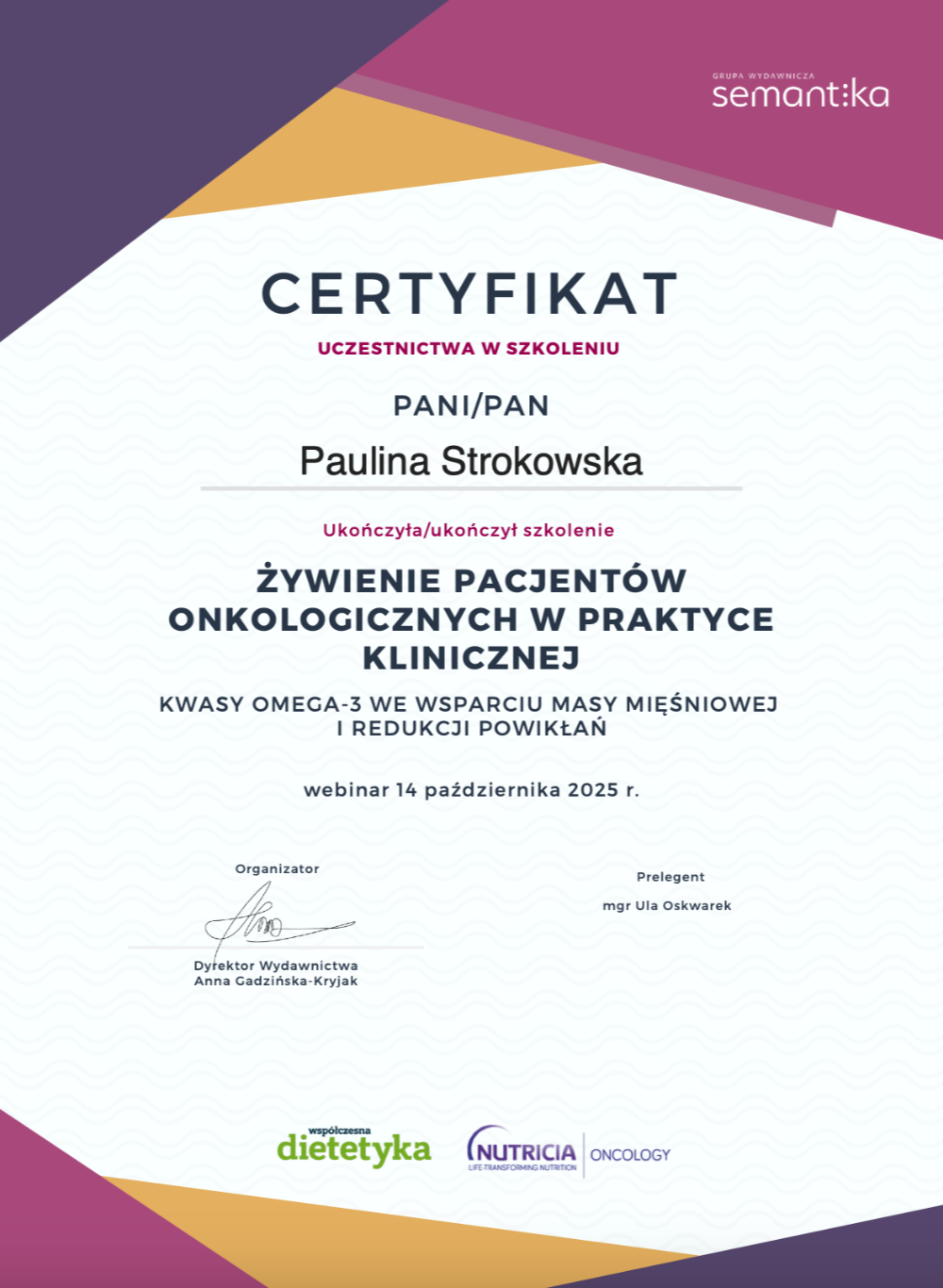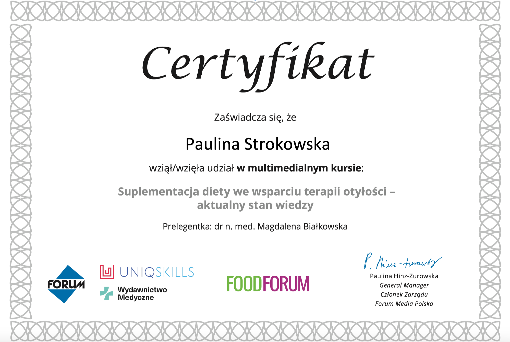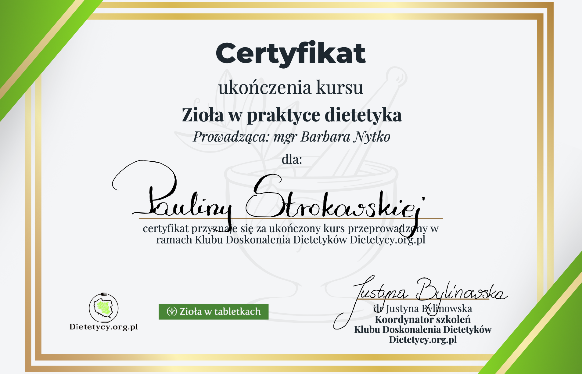 Moje zaangażowanie w dietetykę potwierdzają liczne certyfikaty i dyplomy, które zdobyłam na przestrzeni lat. Dzięki ciągłemu kształceniu i udziałowi w profesjonalnych szkoleniach, mogę zaoferować najwyższy poziom usług dietetycznych.