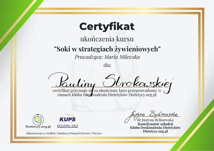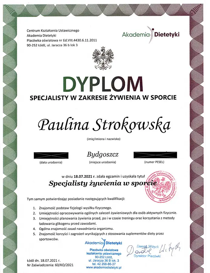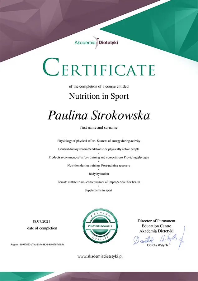 Zdrowe odżywianie zawsze było integralną częścią mojego życia. Moja pasja do tematyki zdrowego odżywiania skłoniła mnie do podjęcia nauki i zdobycia profesjonalnych kwalifikacji. Ukończyłam Dietetykę na Polskim Instytucie Dietetyki we Wrocławiu.